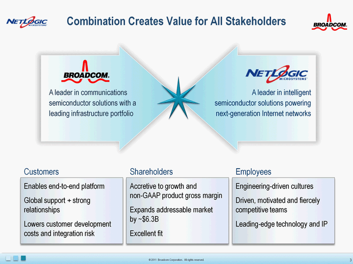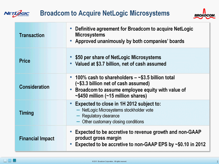 September 13, 2011 Broadcom will give a presentation, together with NetLogic Microsystems, at the