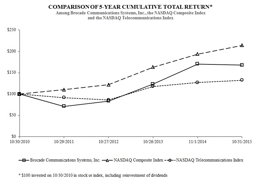 This Annual Report on Form 10-K contains forward-looking statements regarding future events and future results. All statements other than statements of historical fact are statements that could be deemed forward-looking statements, including, but not limited to, statements regarding future revenue, margins, expenses, tax provisions, tax treatment, earnings, cash flows, benefit obligations, debt repayments, share repurchases, or other financial items; any statements of the plans, strategies, and objectives of management for future operations, including planned investments or acquisitions; any statements concerning expected development, performance, success, or market share relating to products or services; any statements regarding future economic conditions or market performance; any statements regarding pending litigation, including claims or disputes; any statements of expectation or belief; and any statements of assumptions underlying any of the foregoing. Words such as “expects,” “anticipates,” “assumes,” “targets,” “projects,” “intends,” “plans,” “believes,” “seeks,” “estimates,” “continues,” “may,” and variations of such words and similar expressions are intended to identify such forward-looking statements. These statements are based on current expectations, estimates, forecasts, and projections about the industries in which Brocade operates, and the beliefs and assumptions of management. Readers are cautioned that these forward-looking statements are only predictions and are subject to risks, uncertainties, and assumptions that are difficult to predict, including those identified below, under “Part I, Item 1A. Risk Factors” and elsewhere herein. Therefore, actual results may differ materially and adversely from those expressed in any forward-looking statements. Furthermore, Brocade undertakes no obligation to revise or update any forward-looking statements for any reason.